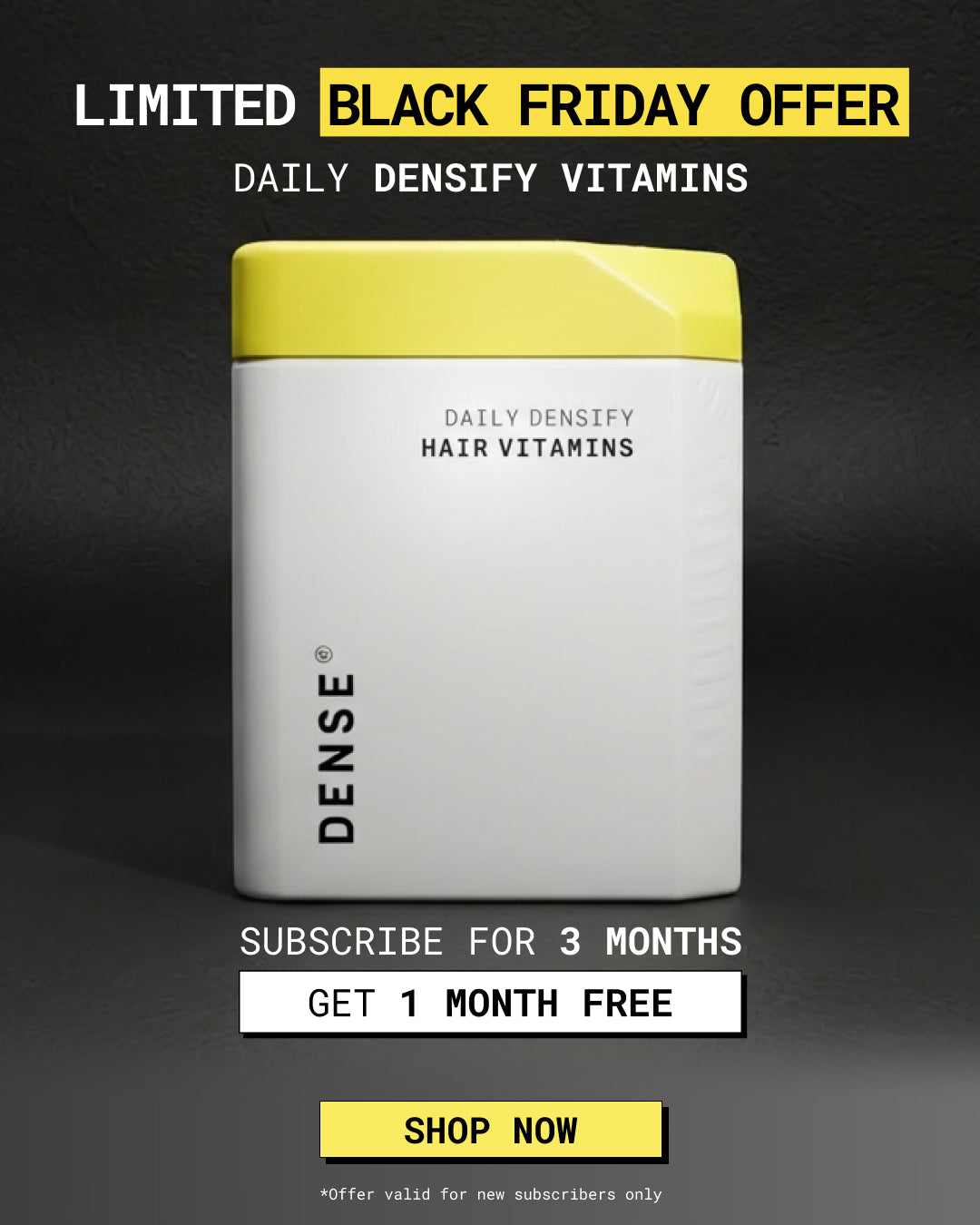 Support your hair from the inside by taking vegetarian-friendly DENSE Daily Densify Vitamins, which include 14 natural ingredients such as Saw Palmetto, Biotin, Zinc and other essential nutrients that help maintain hair thickness and strength.