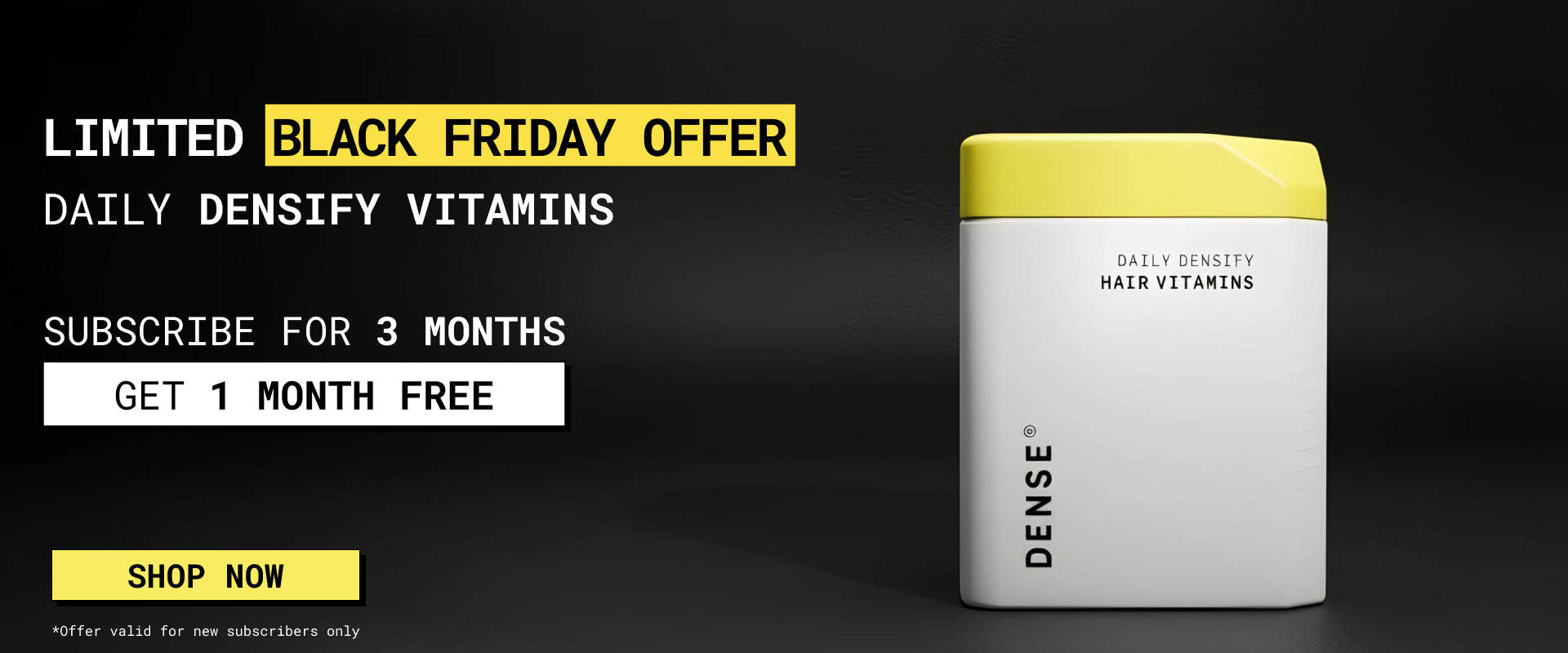 Support your hair from the inside by taking vegetarian-friendly DENSE Daily Densify Vitamins, which include 14 natural ingredients such as Saw Palmetto, Biotin, Zinc and other essential nutrients that help maintain hair thickness and strength.