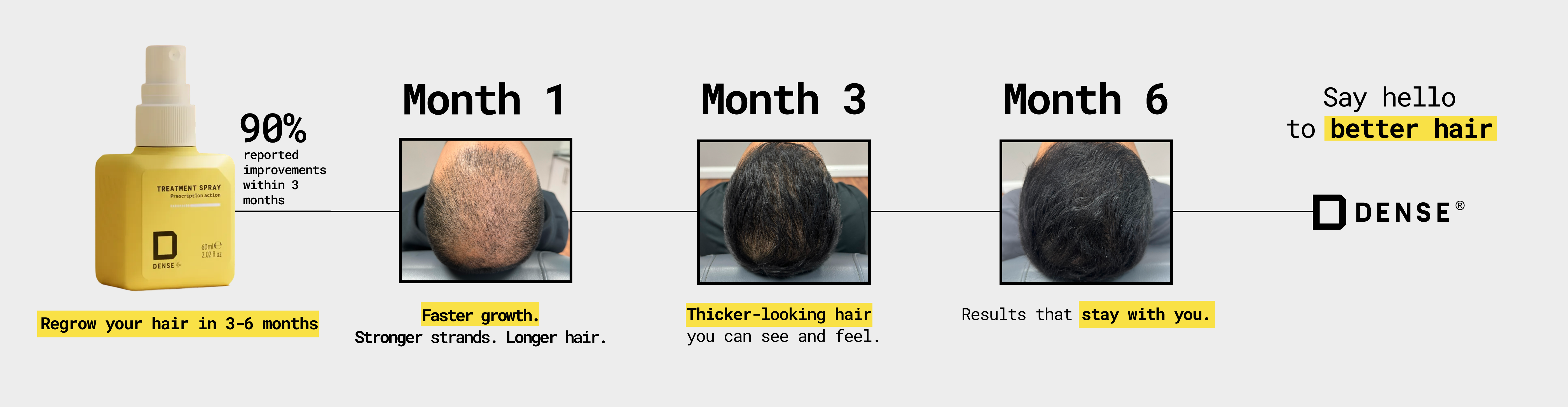 Started Dense about 3 months ago. My barber started noticing my hair thickening up about 8 weeks in. I’ve been combining PRP treatment alongside using Dense as recommended by an expert and those two methods combined have yielded awesome results so far. I recommend this product to anyone suffering from hair loss or thinning hair. 10/10.