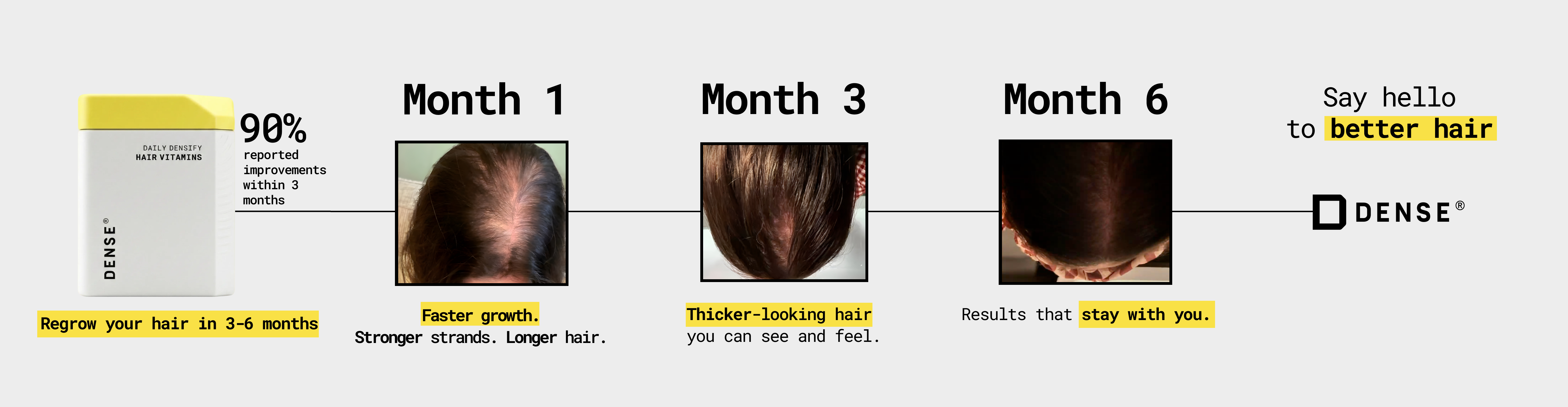 By targeting the root causes of hair loss and thinning, DENSE® Daily Densify Vitamins provide a holistic approach to improving hair and scalp health, promoting not just hair strength and density but also long-term follicular vitality. This all-in-one formula is your ultimate ally in achieving healthier, fuller hair.